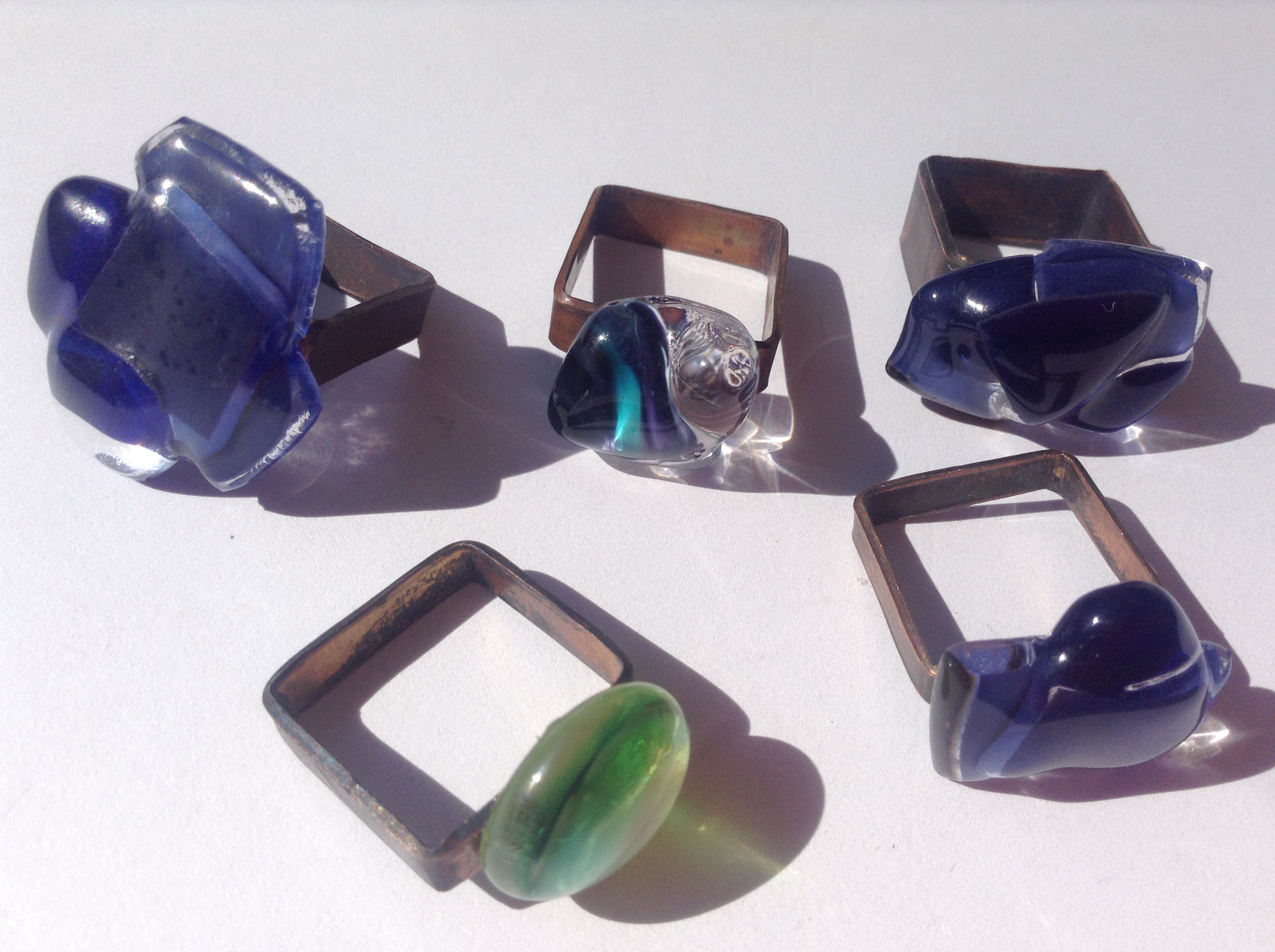 I’m in the mood for rings… recycled fused and cast glass…. square with enamel, resin, recycled paper, Japanese paper, concrete…