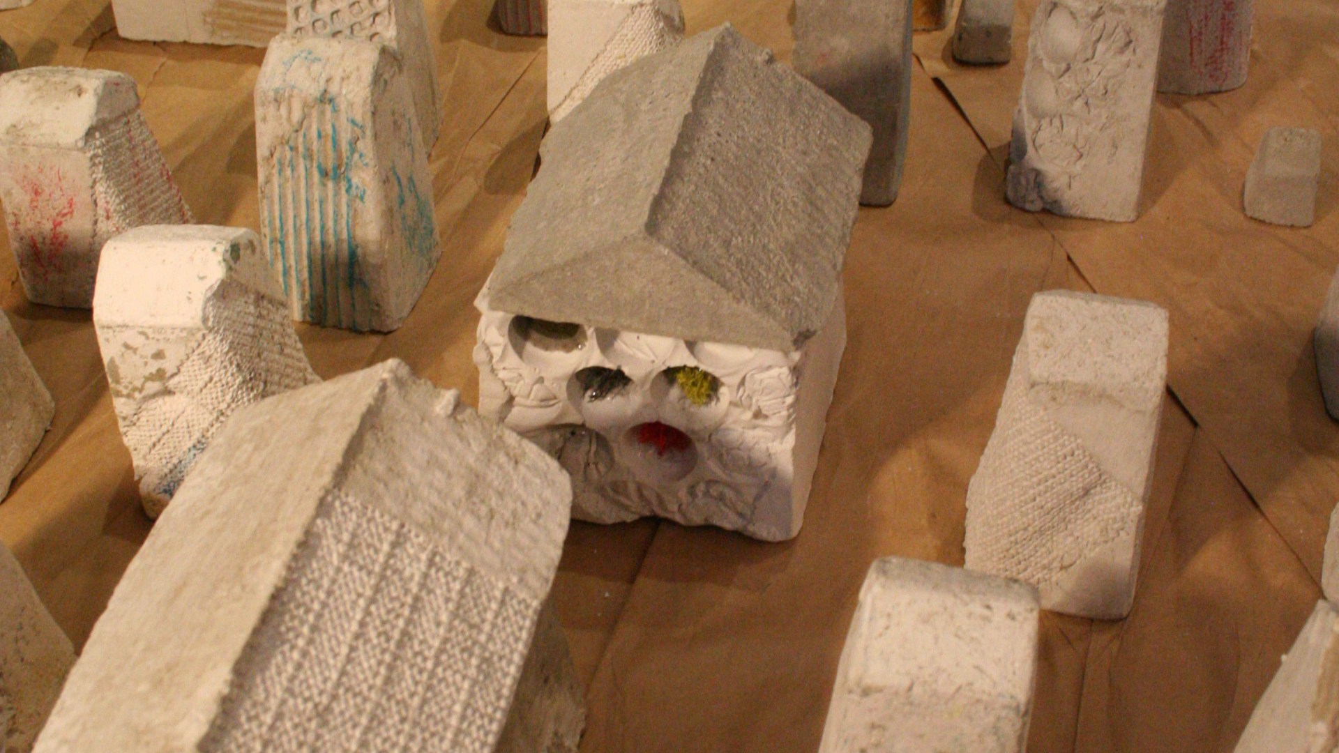 Houses that stand alone in an image are like the sculptures I love to create that are simple objects of art when on display. They are a single unit that we like to touch, feel, look at the textures close up and feel the weight of each one. But, when houses are established in a community or a setting, the house comes to life. This is the life I try to bring to my sculptures. Add a life to the houses by placing them in a setting or installation where we discuss neighborhood design, simple vs extravagant footprint of our house, who gets the sun and more discussions come from these little sculptures.
